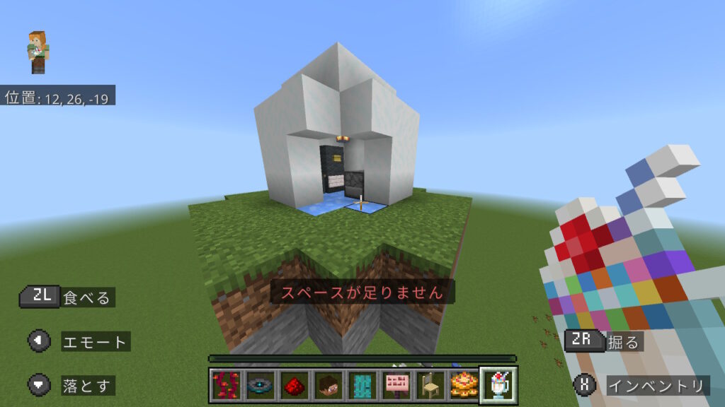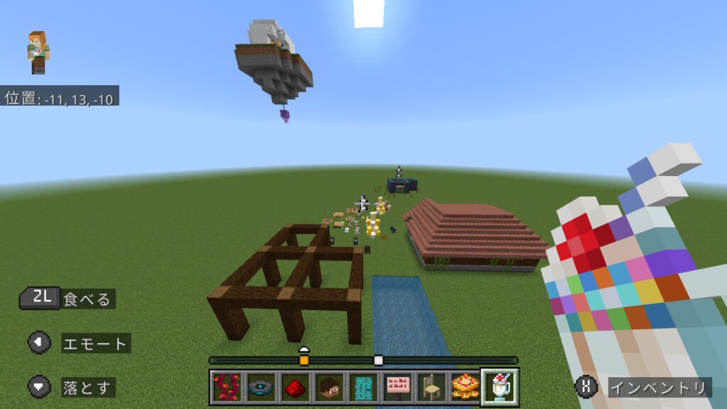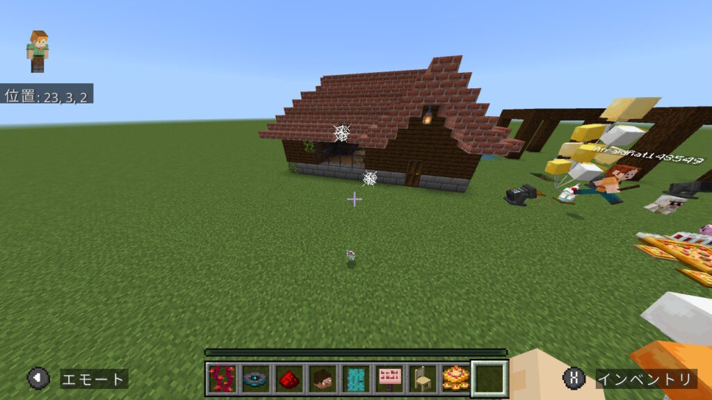 朝会に参加してくれたメンバーのワールドに参加して、 家を作ったり、追加コンテンツのアイテムなどを試したりしてみんなで遊びました。 私含めて追加コンテンツをダウンロードしたメンバー以外は初めて触れるアイテムだったこともあり、「なにこれ!すご!」と感動しながら遊んでおりました。