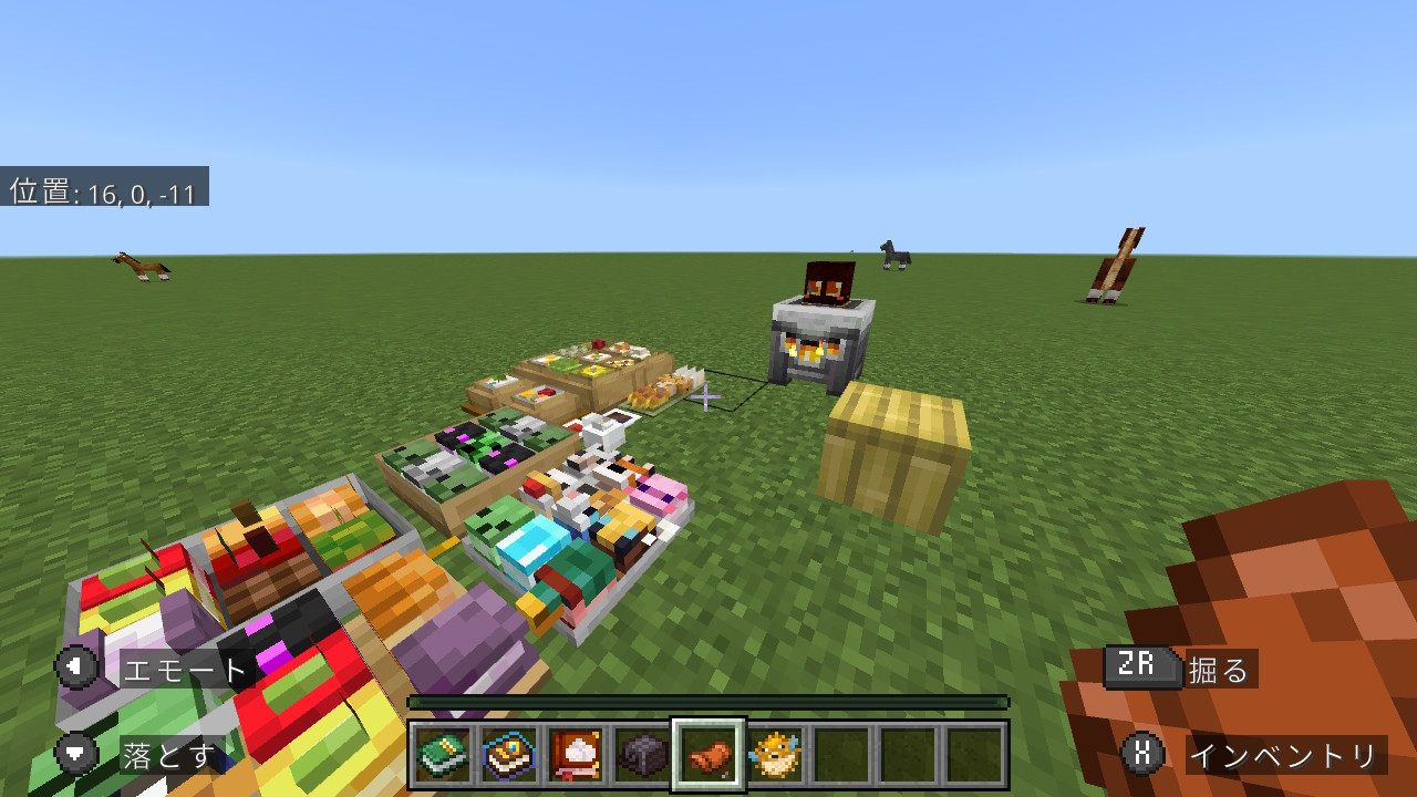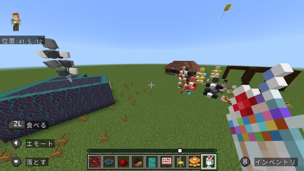 追加コンテンツをダウンロードしたお子さんも私たちに向けて実演しながらたくさん解説してくれました。 色々遊んでいると気づけばワールドの中心部がパーティー会場のようになり、 そこに集まってワールド内でケーキを食べたりもしました。
